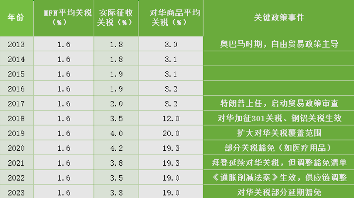 綜合世界銀行、WTO、美國國際貿易委員會(USITC)及彼得森國際經濟研究所數據,近10年美國的平均關税由2013年的1.8%提高到2023年的3.3%,其中對中國商品的關税由2013年的3.0%提高到19.0%。