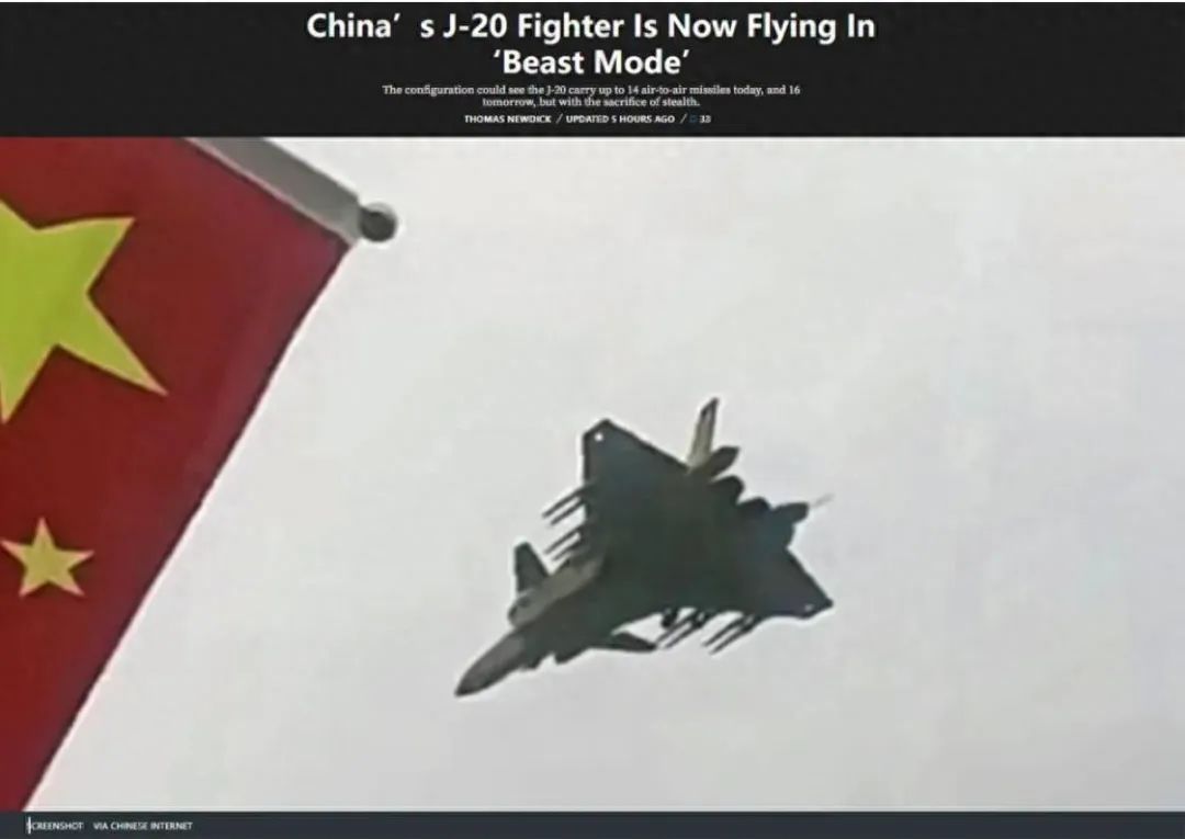 據美國“驅動”網站的“戰爭地帶”專欄報道,社交媒體流傳的視頻及照片顯示,中國正在對“野獸”模式下的殲-20隱身戰鬥機進行測試。殲-20開啓“野獸模式”以後,通過內置彈艙攜帶6枚PL-15和2枚PL-10以外。還可以在翼下的4個外掛點搭載8枚中遠程空空導彈。空空導彈攜載數量達到了前所未有的16枚。