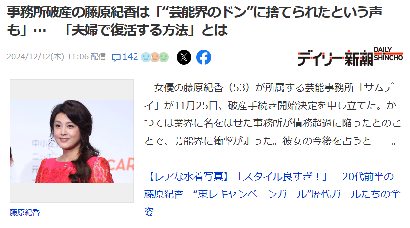 先是去年11月底,藤原紀香的經紀公司サムデイ社長高橋裕,突然宣佈正在辦理破產手續。據悉,サムデイ是被稱為“娛樂圈教父”的周防鬱雄領導的Burning Group旗下的公司,然而當高橋裕以藤原紀香為“籌碼”去找Burning Group求助時,卻沒有得到任何回應。