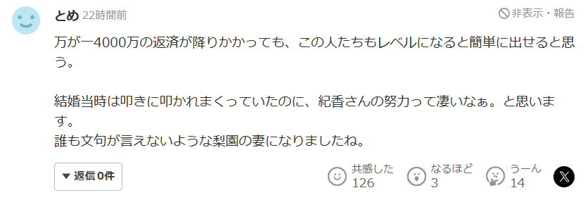 即使萬一真的要面臨4000萬的還款責任,我相信到以藤原紀香的level,也能夠輕易解決問題。
