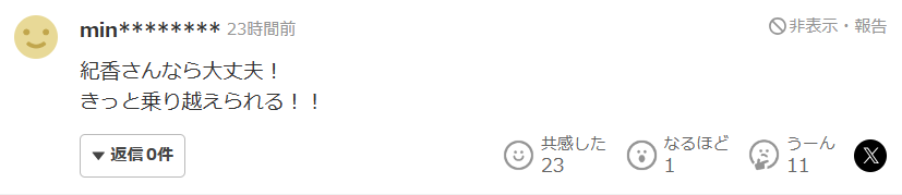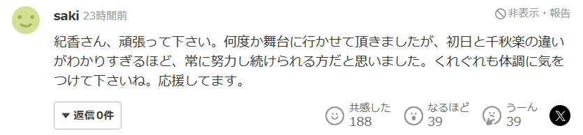 紀香小姐,請加油。有幸去觀看過幾次舞台表演,從首演到最後一場,進步之大讓人深刻感受到您的不斷努力。請務必注意身體,會一直支持你。