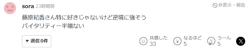 雖然沒有説特別喜歡藤原紀香,但她在逆境中似乎非常堅強,生命力簡直不一般。