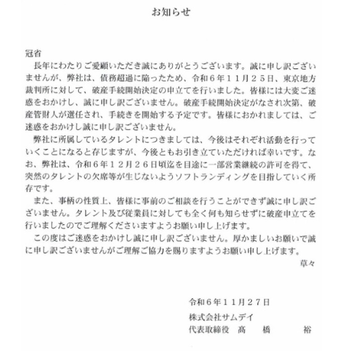 據《週刊女性PRIME》的報道,サムデイ未經藤原紀香本人同意,就擅自拿了她為製作舞台而向關聯企業們籌集來的臨時資金去還債務?!