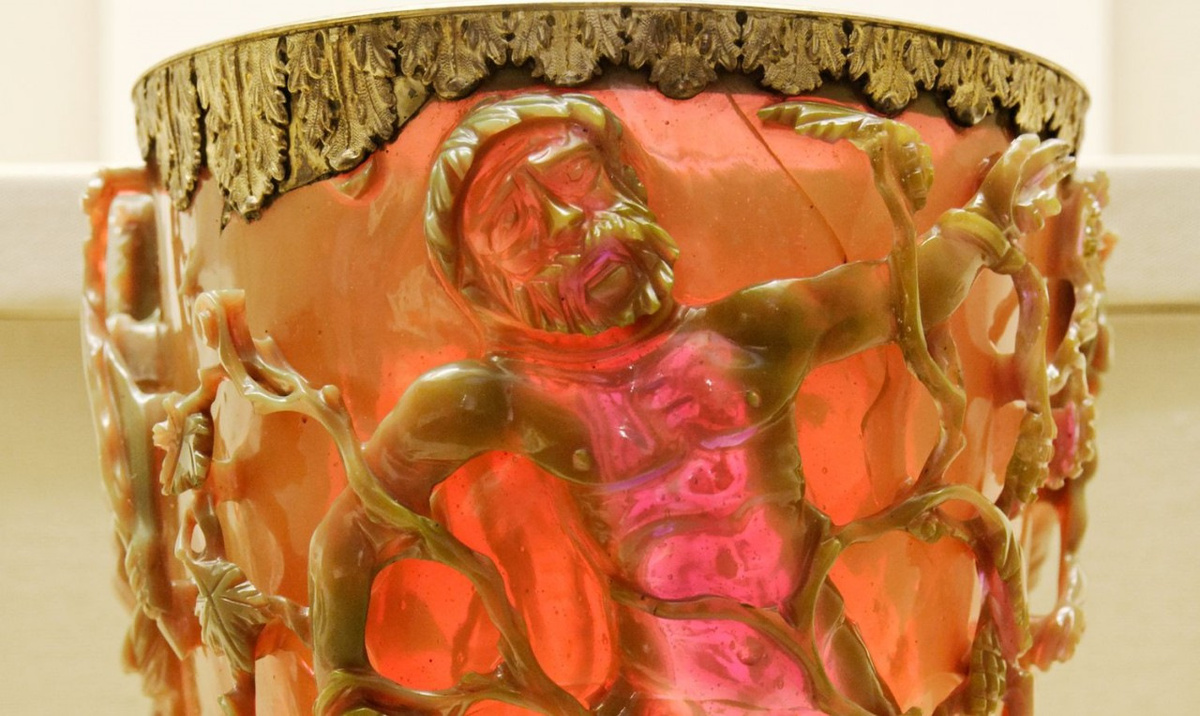 萊克格斯杯是一個獨特的羅馬飲酒杯,約為公元四世紀製作,以其奇特的光學特性和精湛的雕刻而聞名。這個玻璃容器高16.5釐米,直徑13.2釐米,它不僅因其美麗而吸引注意,還因其在不同光線下表現出的顏色變化而神秘莫測。