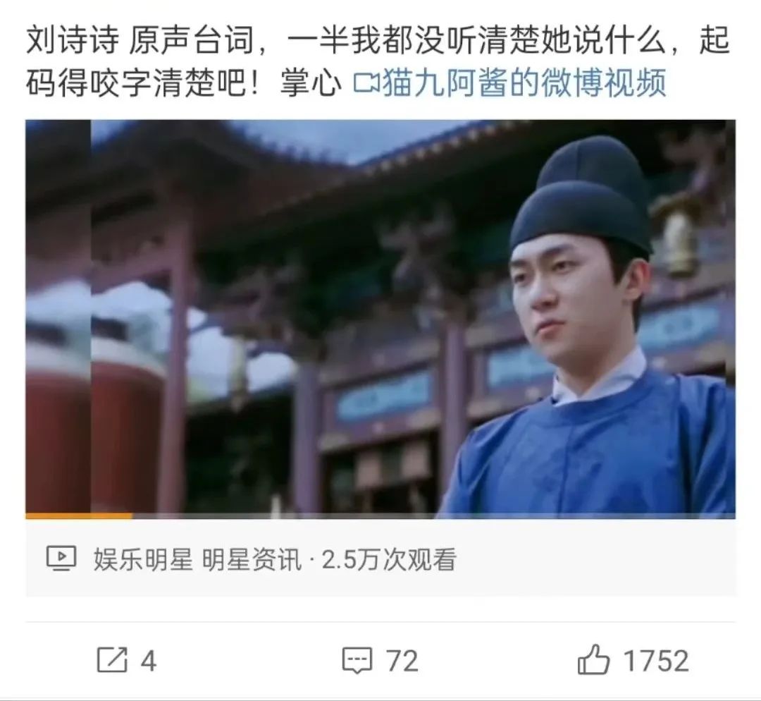 台詞是被吐槽最多,也是被觀眾吐槽最早的一個問題。《一念關山》劇播期間,觀眾吐槽的點在於“出道這麼多年還用配音”,於是在《掌心》中,劉詩詩首度在古裝劇中使用原音,但依舊遭受觀眾吐槽。