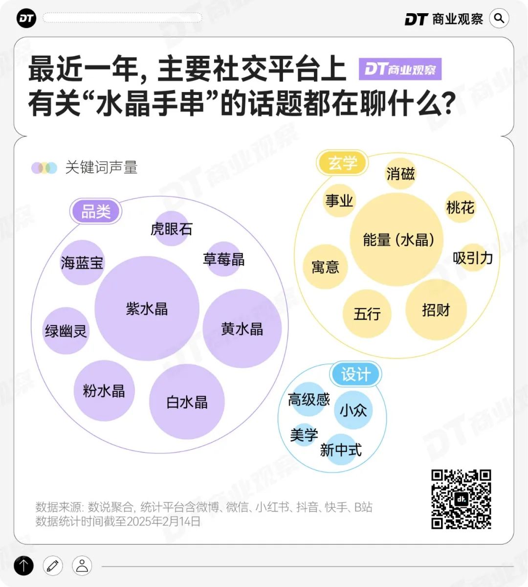 從社交媒體的討論來看,玄學功能是大家買水晶的主要原因——有關玄學功能關鍵詞前三分別是:招財、事業、桃花。
