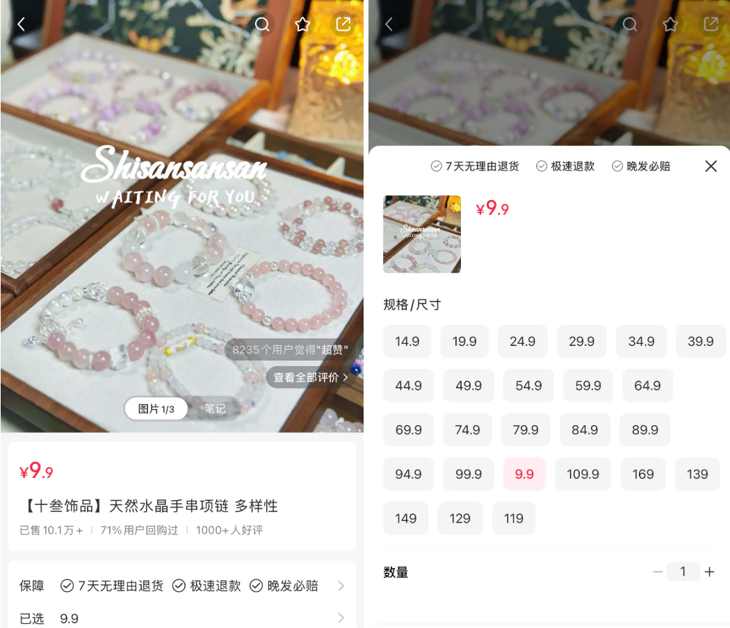 小紅書上的水晶銷售方法也大同小異,銷量最高的水晶手串商品鏈接截至2月19日已售10.1萬+,價格從9.9-119元不等,關聯的筆記文案稱其為“富婆水晶”。