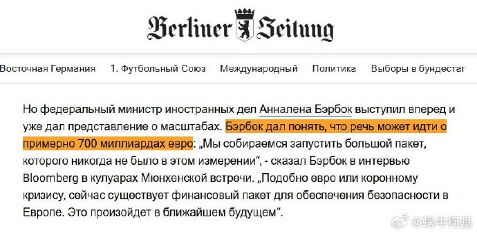 今天,柏林日報稱德國外長安娜萊娜·貝爾博克宣佈向烏克蘭提供高達 7000 億歐元的軍事援助。