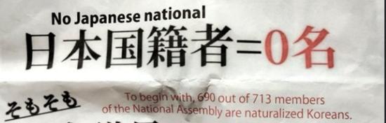 日本神田外語大學關注日本政治和民族主義議題的學者傑弗裏·哈爾就在最近的一則網帖中,曝光了一份日本極右翼的傳單,內容是宣稱日本國會里幾乎每一個議員都是“韓國人”,所以日本政府才會“欺凌日本人”。
