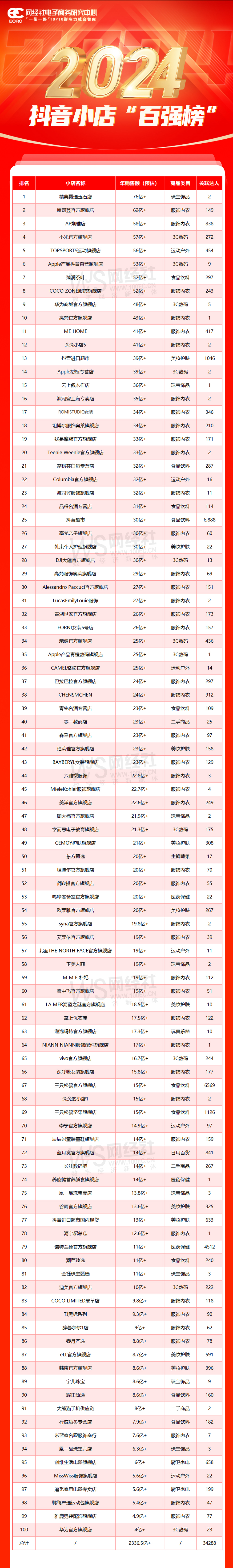 網經社:《2024年抖音小店“百強榜”》發佈:總銷售額超2336.5億_風聞
