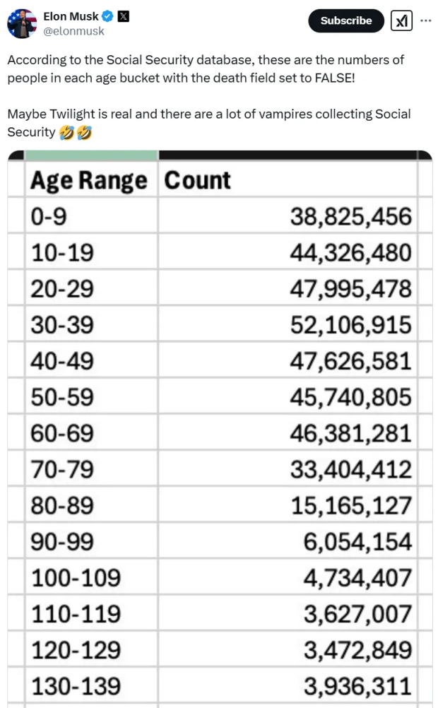 也有些“人”在建國以後也沒有收手,繼續榨取水深火熱的美國人民納税上來的養老金。難怪馬斯克吐槽這些數據:“或許《暮光之城》是真的,吸血鬼們正拿着社保金享受生活。”