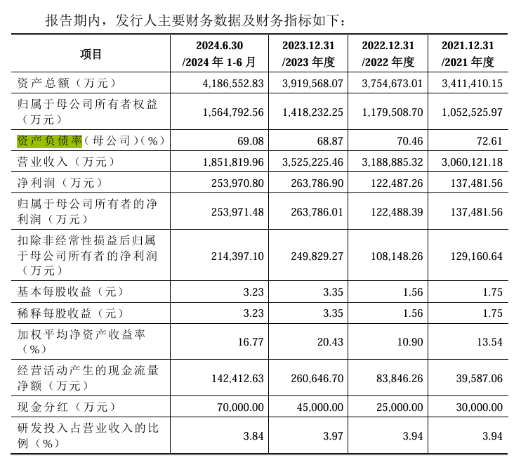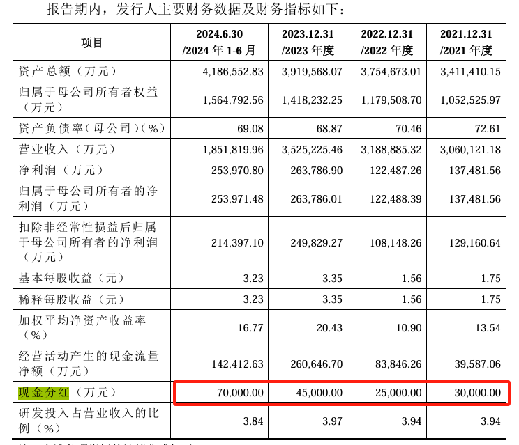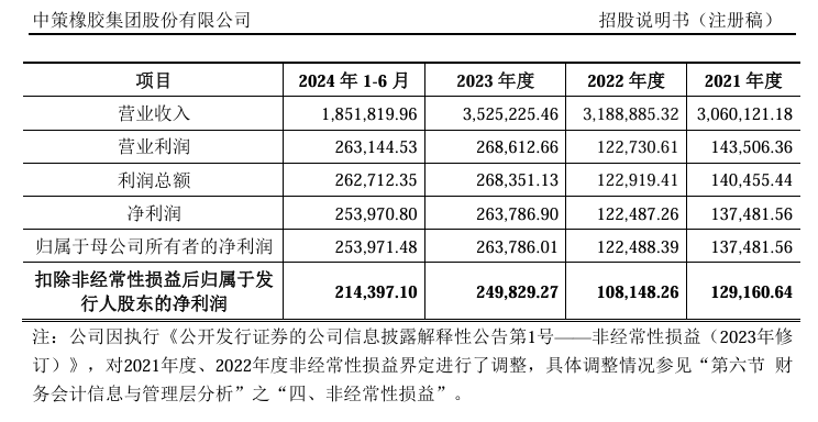 招股書顯示,2021年至2024年1-6月(報告期內),中策橡膠實現營業收入分別約為306.01億元、318.89億元、352.52億元、185.18億元,實現淨利潤分別約為13.75億元、12.25億元、26.38億元、25.4億元。