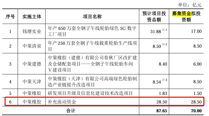 2023年3月1日的招股書中,中策橡膠計劃募資70億元,其中有28.5億元用來補充流動資金。