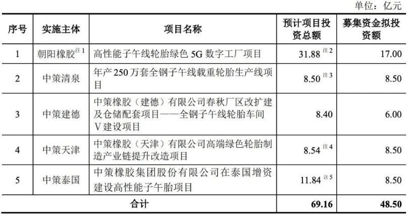 2024年12月29日的招股書中,中策橡膠刪掉了補流項目,擬募資額也從70億元降至48.5億元,將用於高性能子午線輪胎綠色5G數字工廠項目等。