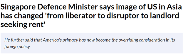 亞洲國家對美國的看法,正在出現微妙的變化,新加坡防長黃永宏乾脆就直説了,過去60年裏,美國在亞洲的外交形象經歷了幾次大轉變,一開始美國是一個具有“道德合法性”的解放者,逐漸淪為橫衝直撞的攪局者,然後成為一個“包租公”。