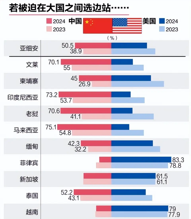 説到這裏就不得不提,去年新加坡智庫一場民調,結果可謂是震動美國戰略界,後者發現,被問及如果要在中美之間選邊站會選誰,東盟內超過一半的受訪者都選擇了中國,雖然比率只有50.5%,可在2023年,美國至少還有61%的支持率。