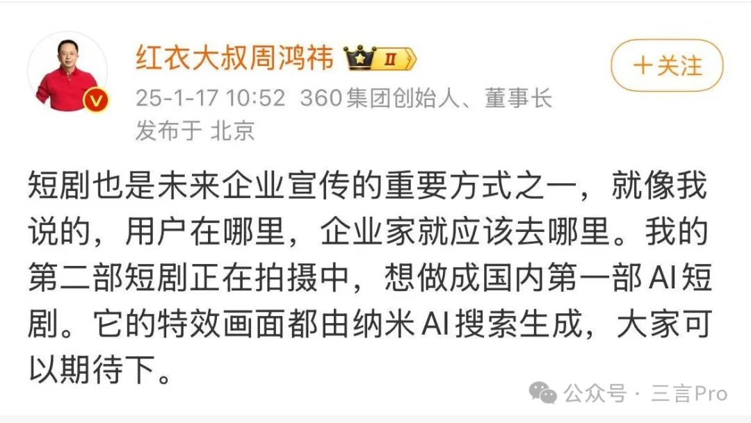 近日周鴻禕透露他參與拍攝的國內首部“AI短劇”也已經開機,估計不久也會上線。