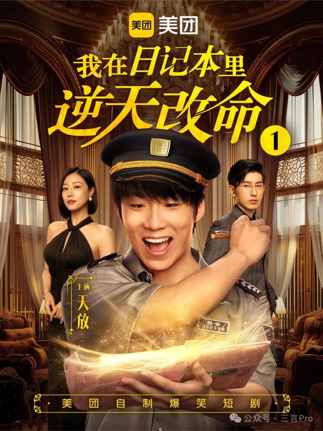 去年8月份,美團發佈首部自制短劇《我在日記本里逆天改命》。該短劇邀請了喜劇演員天放擔當主演,講述了作為男主的天放是一名保安,擁有了一本神奇日記本,只要在上面寫下願望就會被實現,但需要付出代價。