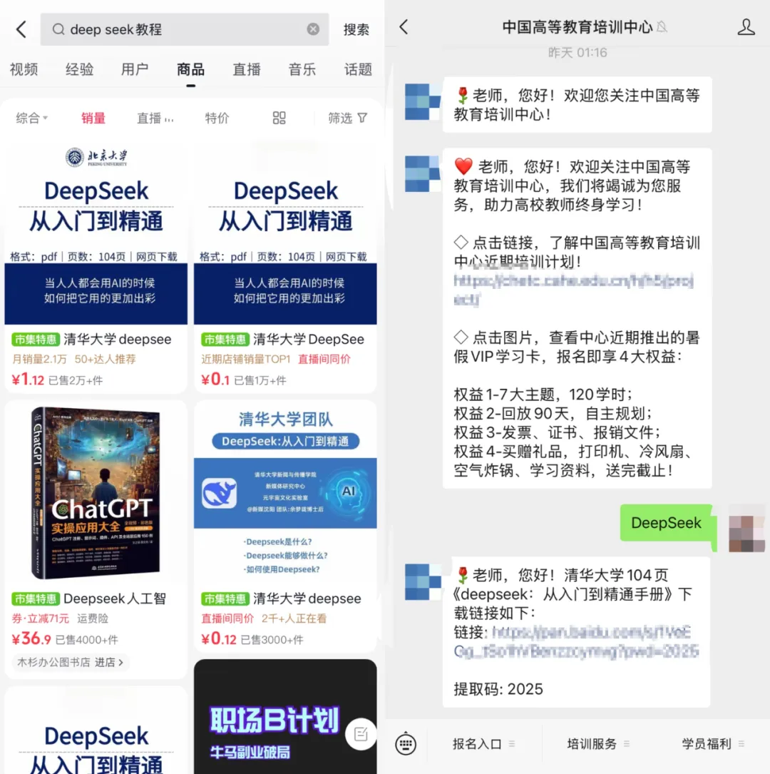 一個頗為魔幻的劇情是,前段時間由清華大學新聞與傳播學院新媒體研究中心元宇宙文化實驗室的餘夢瓏博士後團隊,所撰寫的一份專業文檔《DeepSeek:從入門到精通》,原本是免費分享的,如今卻成了“申留們”在網絡上鋪得最廣的一份貨源。