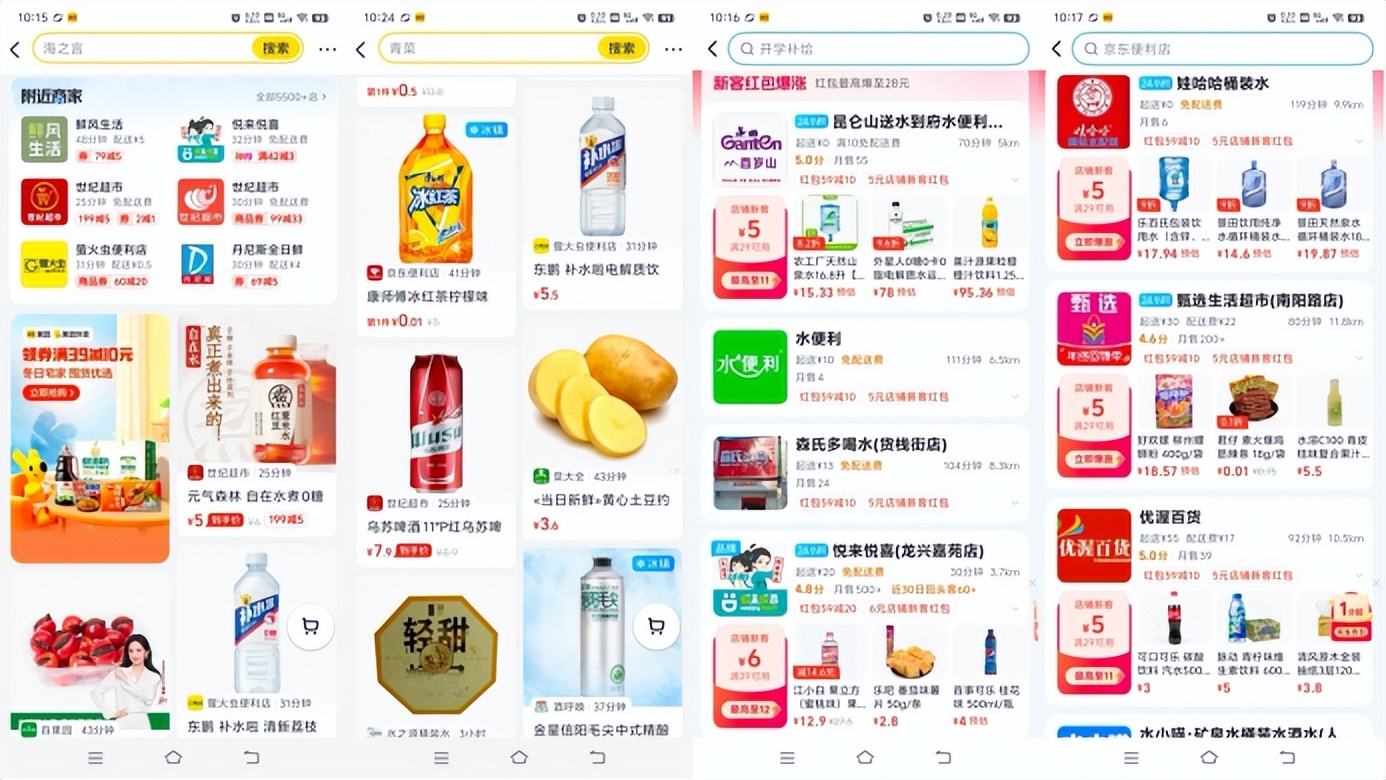 (左邊兩張為美團閃購、右邊兩張為餓了麼“超市便利”)
