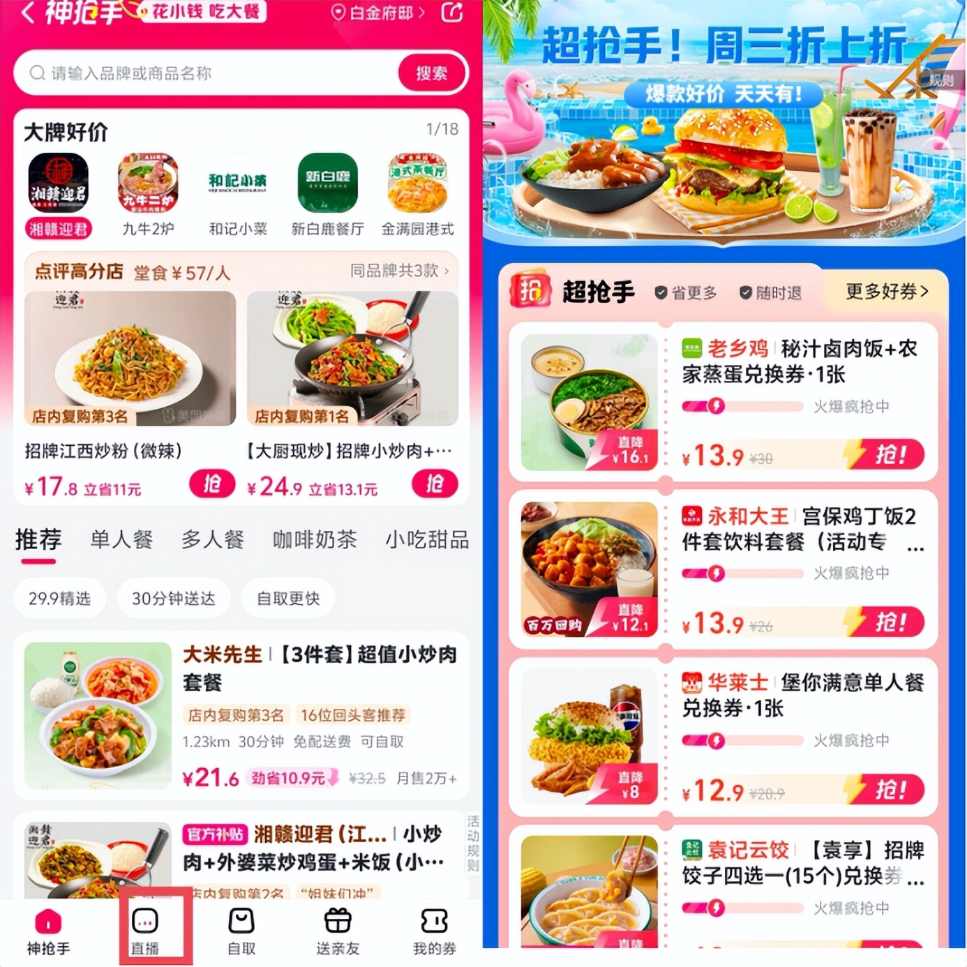 去年12月,餓了麼也專門推出“超搶手”頻道,針對商家單品爆款進行低價促銷,在功能和命名上都明顯對標美團“神槍手”,但美團“神槍手”內已經有短視頻、直播等多元內容形式,餓了麼“超搶手”內只有傳統圖文。