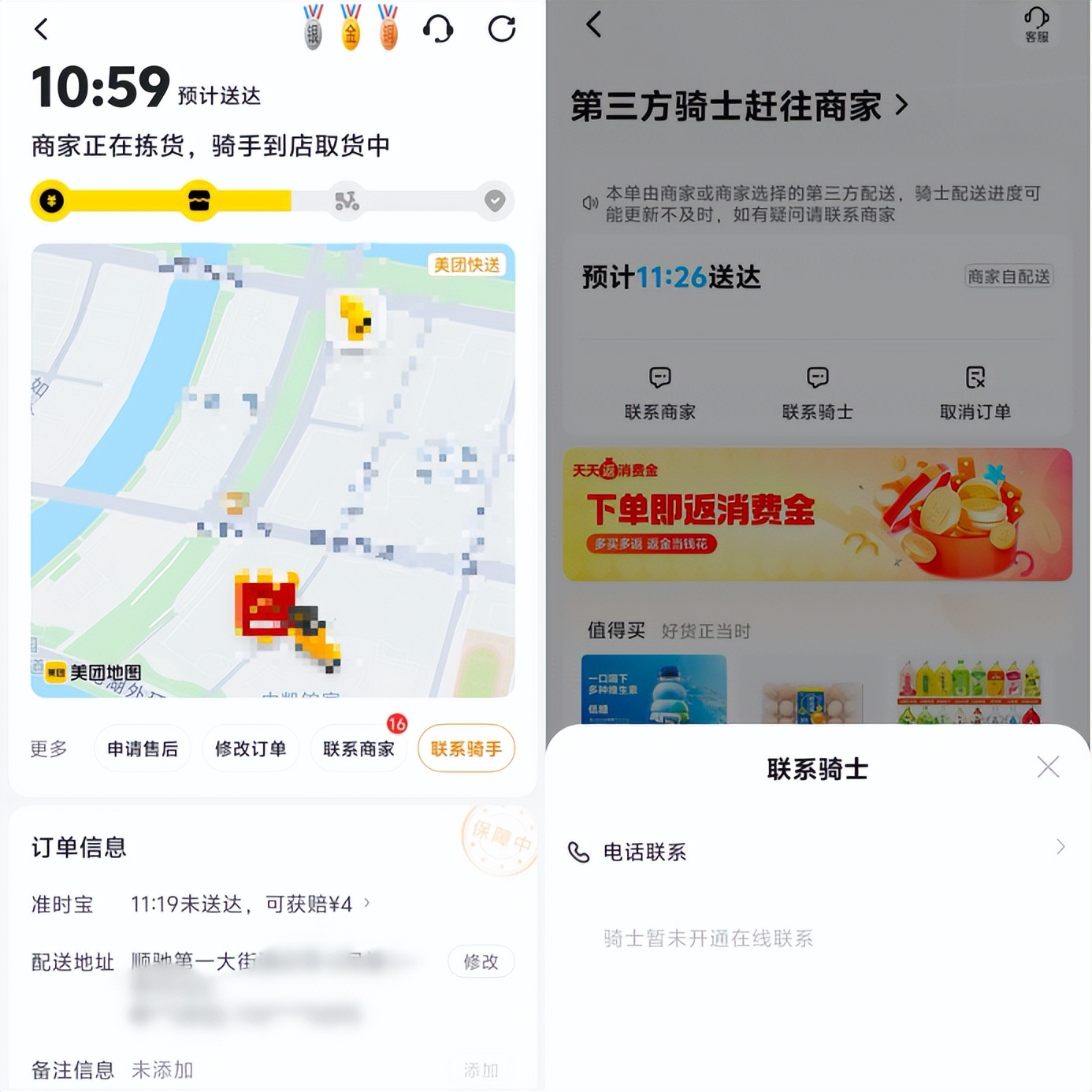 服務細節不同,體驗感自然不同。藍媒匯在美團上選擇了一家“預計25分鐘送達”的單店商家,為快送騎手配送;在餓了麼上“預計55分鐘送達”的單店商家為自配送,並且無法線上聯繫騎手。