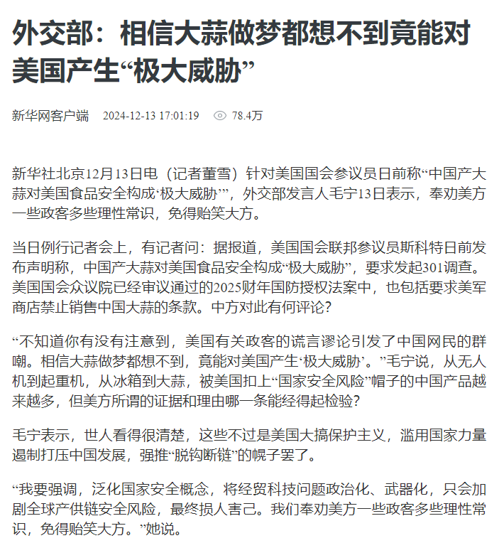 “國家安全”是他們最泛用的藉口,所謂美國安全一籮筐啥啥都能往裏裝。當年無論是在其國內禁止使用華為5G設備,還是想方設法限制中資對其港口投資,主要的理由都是“威脅國家安全”。由此被列入所謂“實體清單”的中國科創公司,被叫停的中企參與的項目和交易,不可勝數,甚至於中國造起重機、中國產大蒜也能“威脅美國安全”……