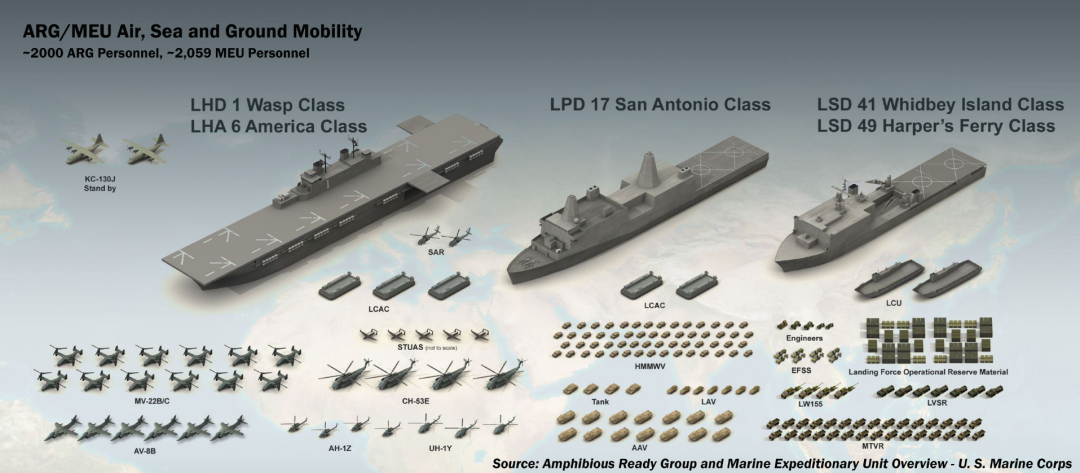 總的來講,一個海軍陸戰隊遠征隊地面突擊力量也相當於一個合成營,加上空中突擊力量。這意味着一個ARG可以用於投送的兵力相當於兩個營,算上航空兵力量的話,基本相當於一個陸戰隊加強團的戰鬥力。