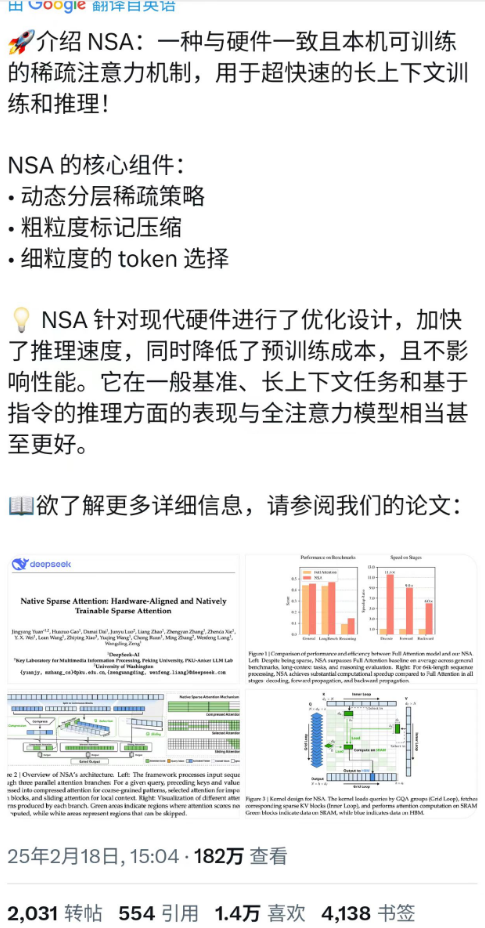 就在Grok3發佈的當天,DeepSeek團隊也發表了一篇論文(https://arxiv.org/pdf/2502.11089),介紹了一種新的稀疏注意力機制(Natively Sparse Attention,NSA),用於提升長文本訓練和推理的效率,並具備硬件對齊和端到端訓練的特性。