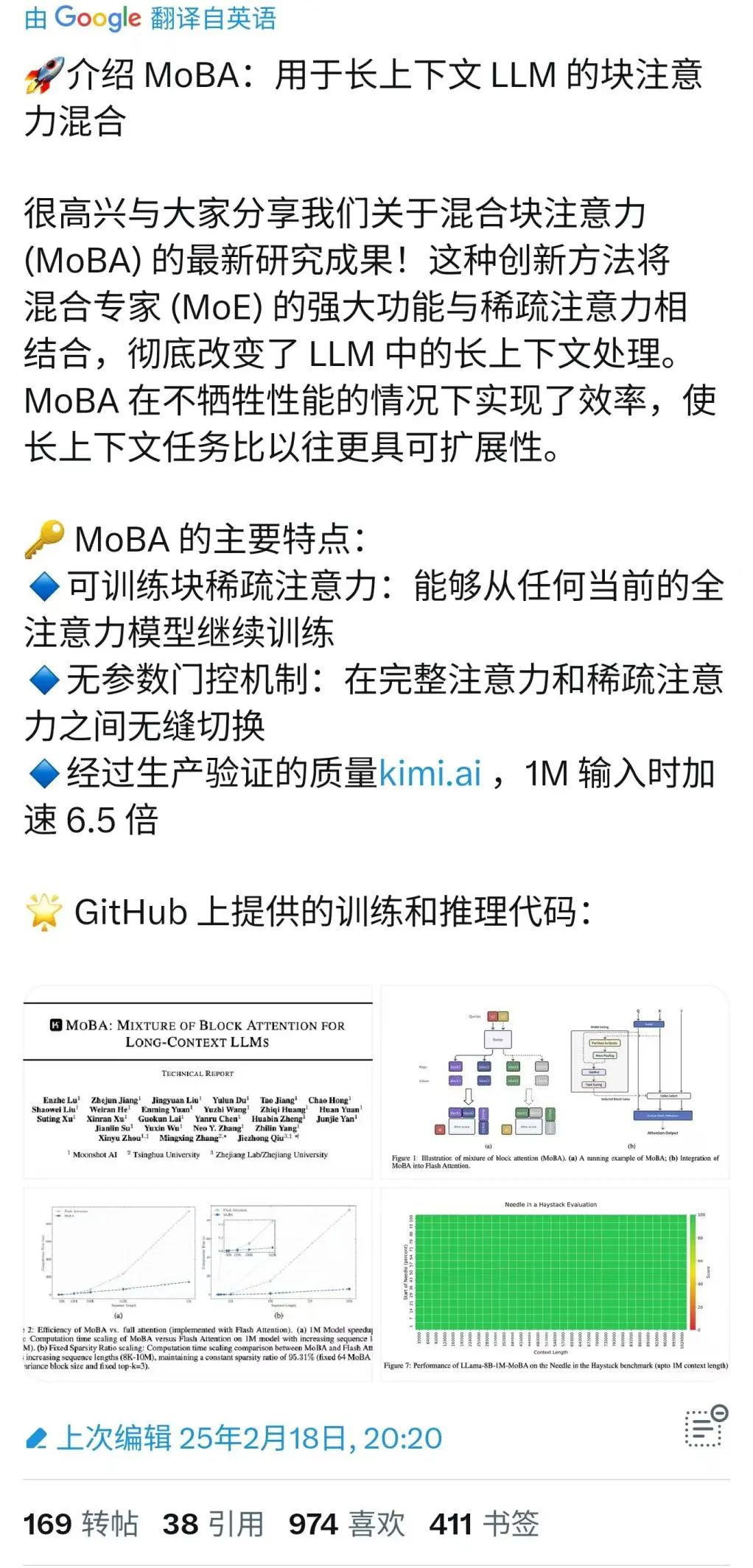 DeepSeek發佈論文的同一天,Kimi也發佈了與NSA類似的MoBA,同樣採用了稀疏注意力的機制,旨在解決大語言模型處理長上下文時計算成本過高的問題。(論文鏈接https://github.com/MoonshotAI/MoBA/blob/master/MoBA_Tech_Report.pdf)