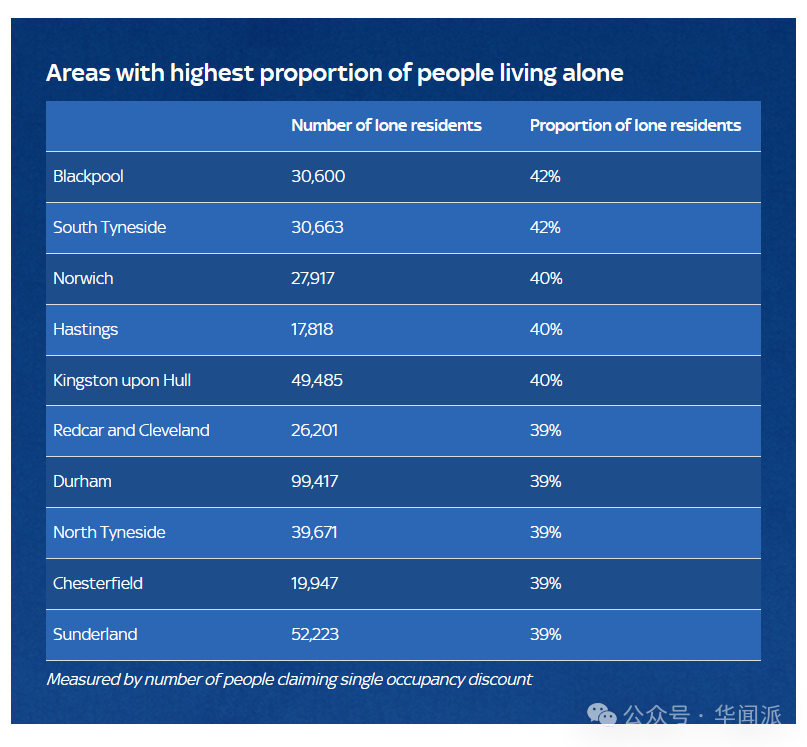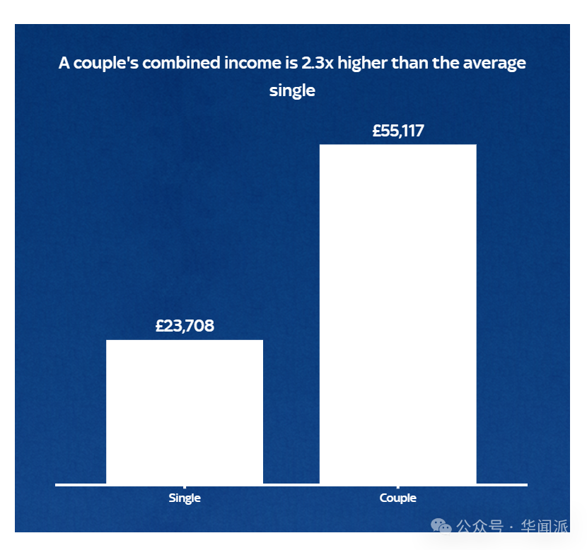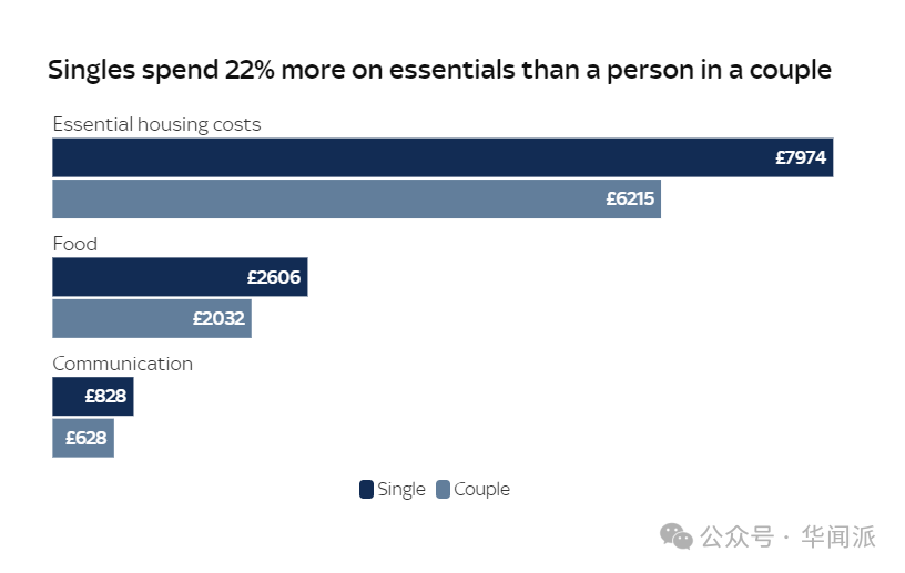 Hargreaves Lansdown投資公司為天空新聞提供的數據顯示,英國單身人士在房租或房貸、地方税和能源費用上的支出比情侶要高22%,在食品上的支出高28%,而在寬帶和電話上的支出則高出32%。