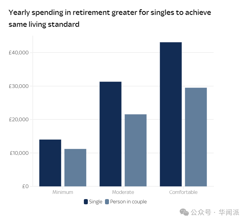 數據顯示,退休後享受中等生活水平,單身者每年需花31,300鎊,而情侶每人僅需21,550鎊。