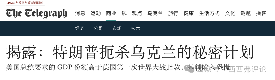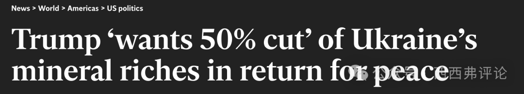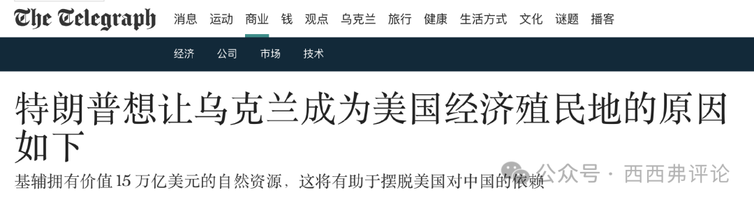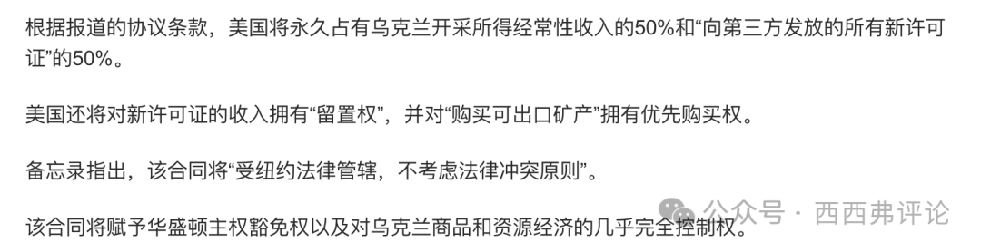《每日電訊報》稱,獲得了一份標有“機密”的初步協議草案,日期為 2025 年 2 月 7 日。根據合同草案,美國向烏克蘭提供了一份要求償還5000億美元的協議,涉及烏克蘭稀土礦產的管理、港口、基礎設施以及石油和天然氣等大部分資源。《每日電訊報》稱,**這些條件甚至比 1945 年戰敗後對德國和日本實施的制裁更為嚴厲。**如果這份草案被接受,特朗普的要求佔烏克蘭國內生產總值的份額將高於《凡爾賽條約》對德國徵收的賠款。