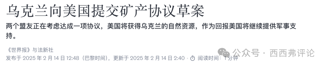 根據世界報和法新社報道,烏克蘭已經向美國提交了礦業協議草案。草案的具體條款不明,據報道,美國要求擁有烏克蘭50%的關鍵礦產石油天然氣港口基礎設施。