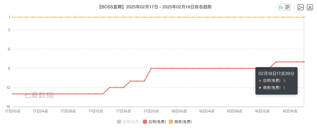 七麥數據顯示,BOSS直聘、智聯招聘等軟件下載量都迅速提升,BOSS直聘從1月31日起,就位列蘋果應用商店免費榜商務應用TOP1至今,在全部應用免費榜上的排名則躍升至2月18日的第8名。