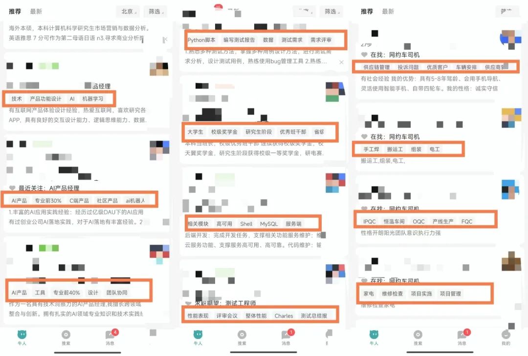 標籤來自哪裏呢?就來自求職者填寫的在線簡歷。AI模型會自動提取求職者的簡歷標籤,把這些標籤放在牛人卡片裏。HR視角打開BOSS直聘,一眼就能看到。