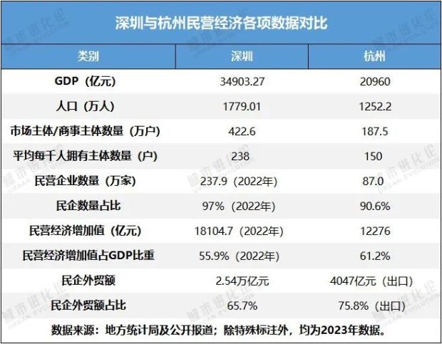 外貿方面,2023年,深圳民營企業進出口2.54萬億元,佔65.7%;杭州只公佈了出口數據,2023年民企貨物出口4047億元,佔全市貨物出口的75.8%。