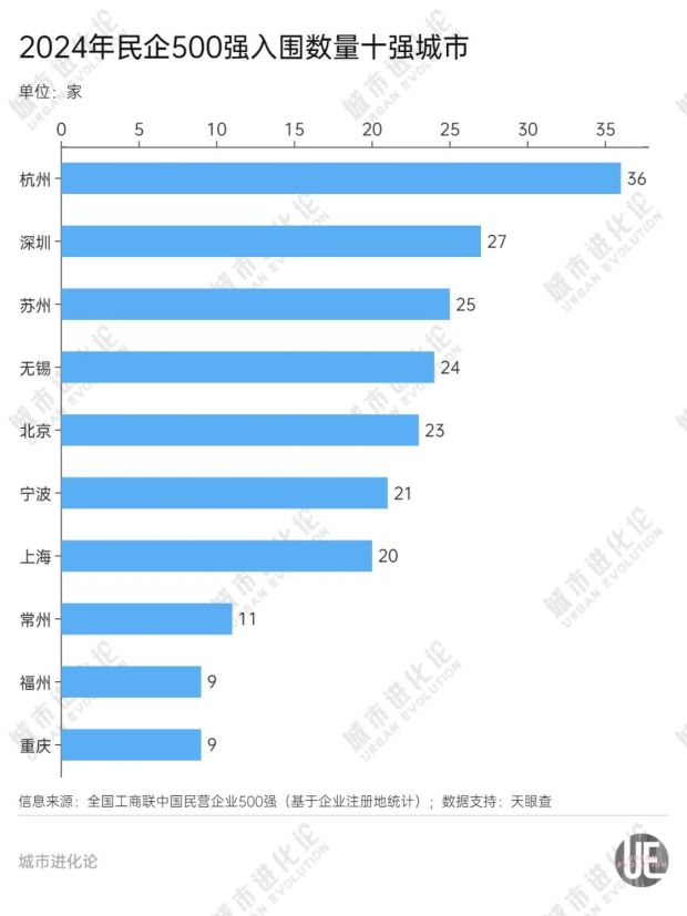 城市進化論基於企業註冊地梳理數據,2024年,杭州有36家企業進入中國民營企業500強,總營收達到4.43萬億元,數量在全國城市中排名第一。《杭州日報》稱,這已是杭州連續22年蟬聯該榜單第一。