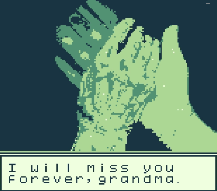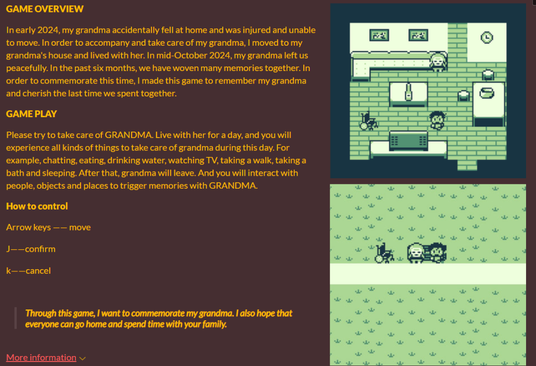 Game Boy的黃綠像素畫面,被週一忱佈置成了奶奶家客廳的樣子。早上買好早餐陪奶奶吃飯,下午推着輪椅陪她散步,與老友見面聊天,晚上餵奶奶吃藥,睡前給奶奶洗澡,擦拭身體,準備好第二天要用的東西。如此循環幾十次,奶奶便會安詳離開,遊戲進入尾聲,整個流程大概在五分鐘左右。