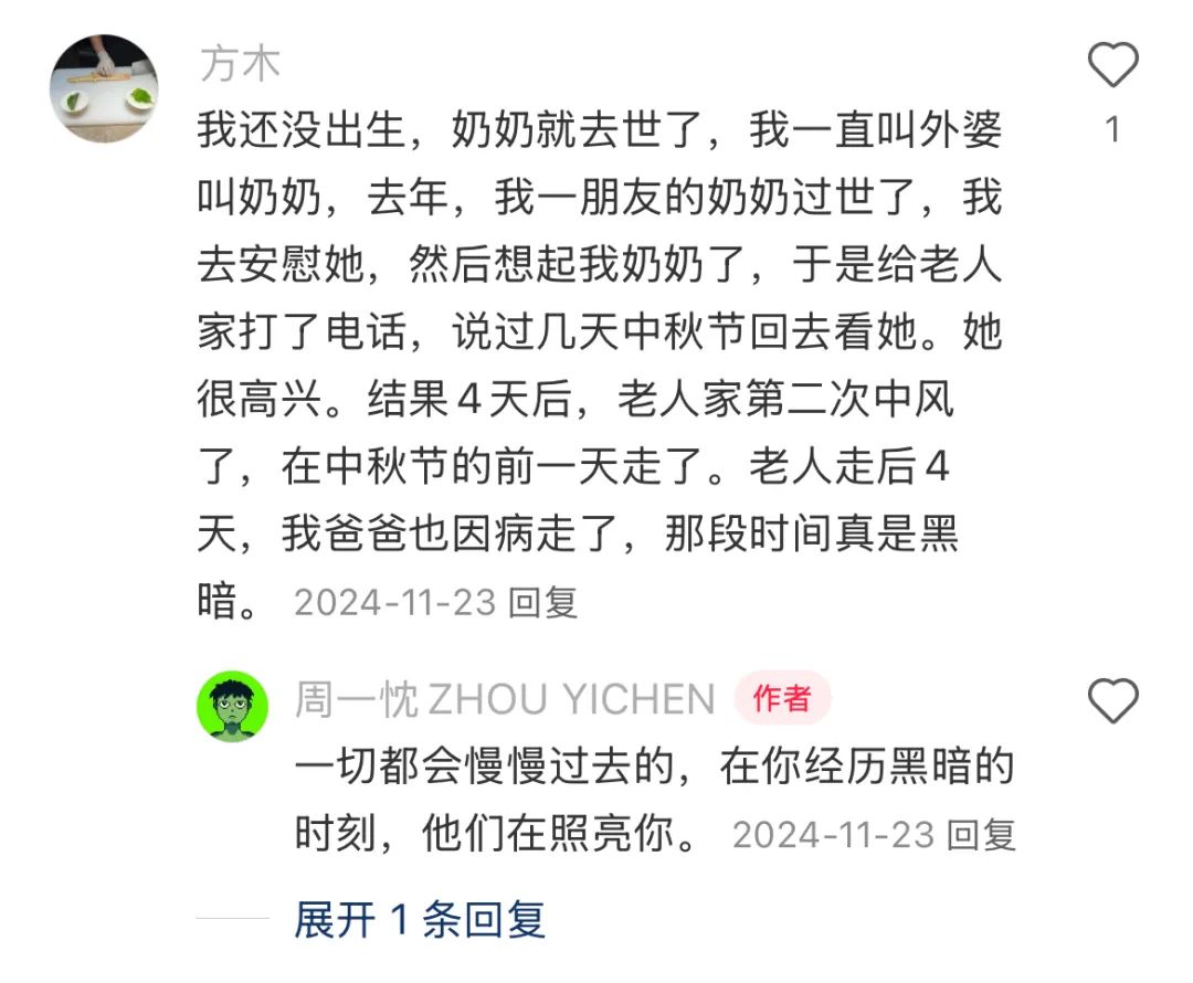 但讓週一忱沒想到的是,他像往常一樣,將這部記錄個人回憶與思緒的作品發到小紅書後,卻得到大量網友共鳴。評論區裏有人説“看哭了”;有人回憶起童年,奶奶花了一整個月工資給自己買NDS;有人感謝週一忱讓他想起自己的奶奶,決定最近找時間回去看看。