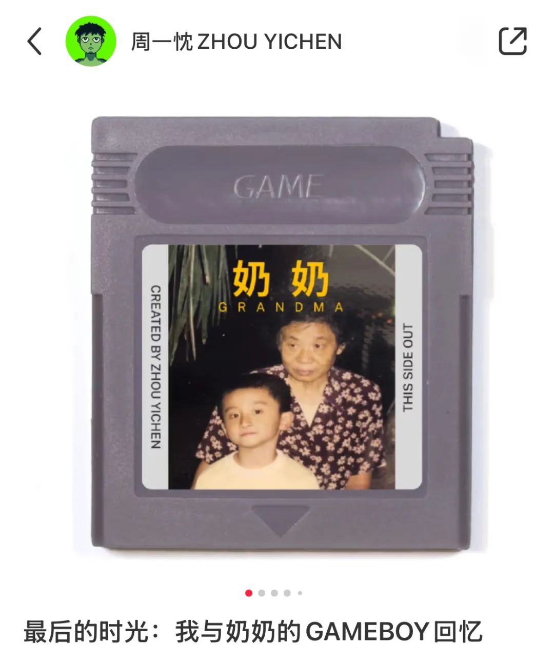 前段時間,週一忱在自己的小紅書賬號發了一條筆記,標題叫作《最後的時光:我與奶奶的Game Boy回憶》,配圖是自制的Game Boy卡帶,上面貼着童年週一忱和奶奶的合照。