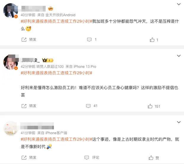 這事被曝光後,相關話題快速衝上熱搜,無數網友,給這家好利來門店,貼上了**「周扒皮」的標籤**,也有網友表示:「是更應該關心員工身心健康麼?這並不是一件值得鼓吹的事情」「連續工作29個小時?!這個是值得讚揚的事嗎?好傢伙,比周扒皮還厲害」