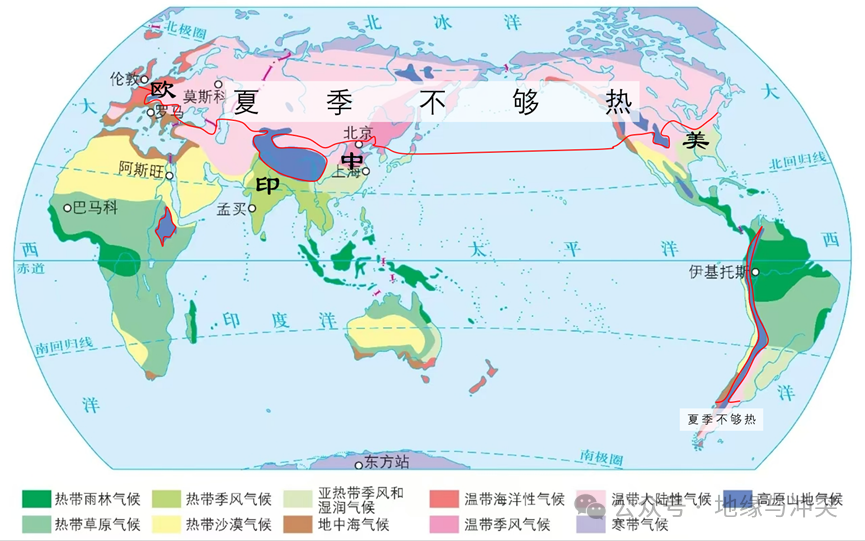 總結一下,中國符合典型雨熱同期及隱藏屬性;美國和印度表象符合,美國平原的問題是“冷的時候雨太多”,印度的問題是“雨少的時候温度太高”;歐洲則完全不符合雨熱同期特徵,且地中海氣候區完全相反,冬雨夏旱。