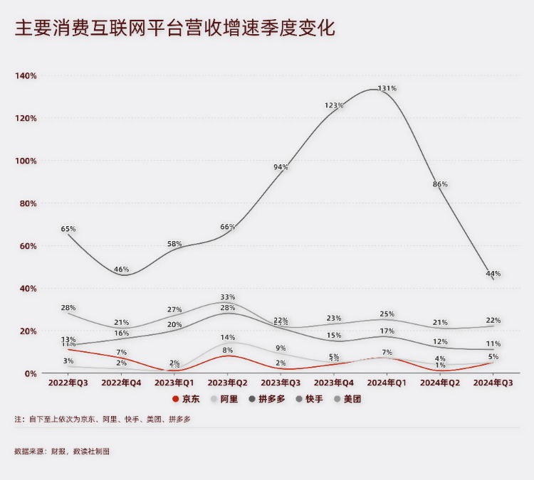 由於京東自營業務佔據很高比例,前三季度,京東整體營收為8118億,同比增長5.2%。快手前三季度的GMV達到9275億元,增速為18.8%。按照目前的勢頭,京東有很大的危險會被快手超越,掉到行業第五。
