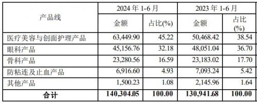 在 2024 年上半年,若按照治療領域對上海昊海生物科技股份有限公司(以下簡稱 “昊海生科”)的產品線進行劃分,主要涵蓋醫療美容與創面護理產品、眼科產品、骨科產品、防粘連及止血產品以及其他產品。其中,這幾類產品的營收佔比分別為 45.22%、32.18%、16.59%、4.93% 和 1.08%。