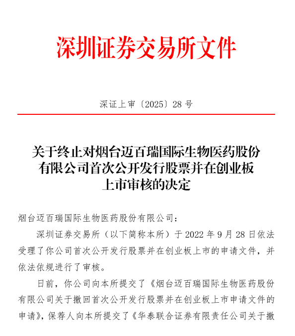 2025年2月16日,深交所官網發佈公告稱,煙台邁百瑞國際生物醫藥股份有限公司(簡稱“邁百瑞”)、保薦機構撤回發行上市申請,深交所所決定終止其創業板發行上市審核。