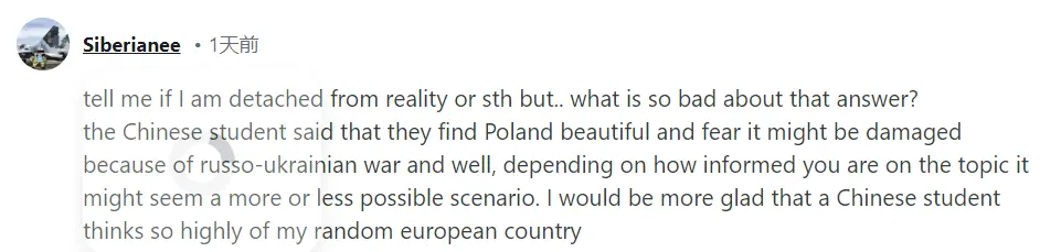 中國學生説,他們覺得波蘭很美,但擔心它可能會因為俄烏戰爭而遭到破壞。我更高興的是,一箇中國學生如此看重我的歐洲國家。