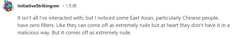 我接觸過的部分亞裔中,尤其是中國人,口無遮攔。他們內心裏沒有惡意。但説出來的話或者行為,卻讓人覺得極其粗魯。