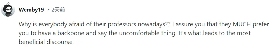 為什麼現在每個人都害怕自己的教授?我向你保證,他們更希望你有骨氣,説出令人不舒服的話。這才是有意義的討論。
