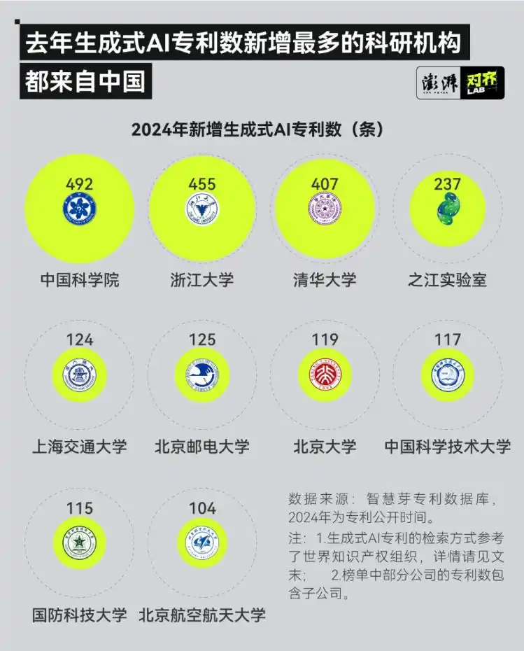 就在前幾天,澎湃新聞梳理出了2024全球生成式AI專利數據分佈圖,顯示生成式AI專利新增最多的學術機構來自中國,中國科學院以 492 件新增生成式人工智能專利數位列第一,浙江大學和清華大學緊隨其後。